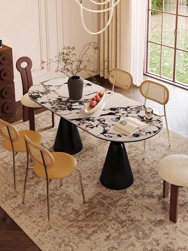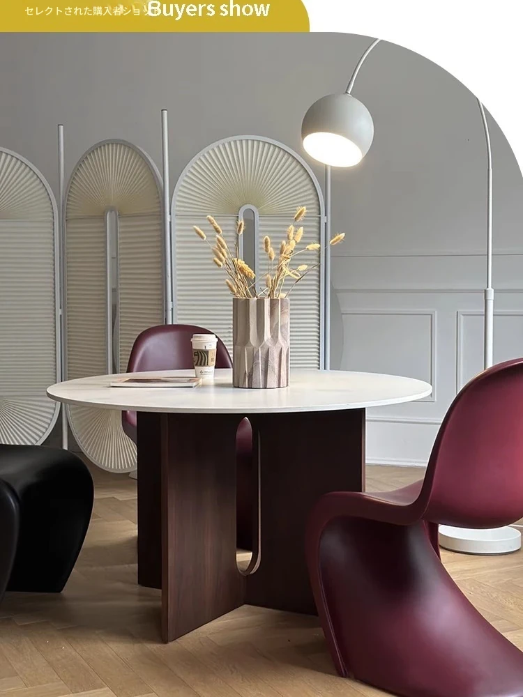 【魅力复古】北欧式ウォールナット円形ダイニングテーブルセット - フレンチスタイルのコンパクトリビングに最適!アイスランド岩板テーブルとチェアの組み合わせで洗練された空間を演出。