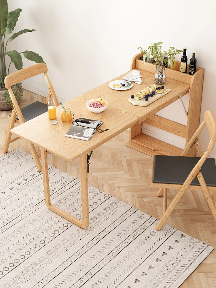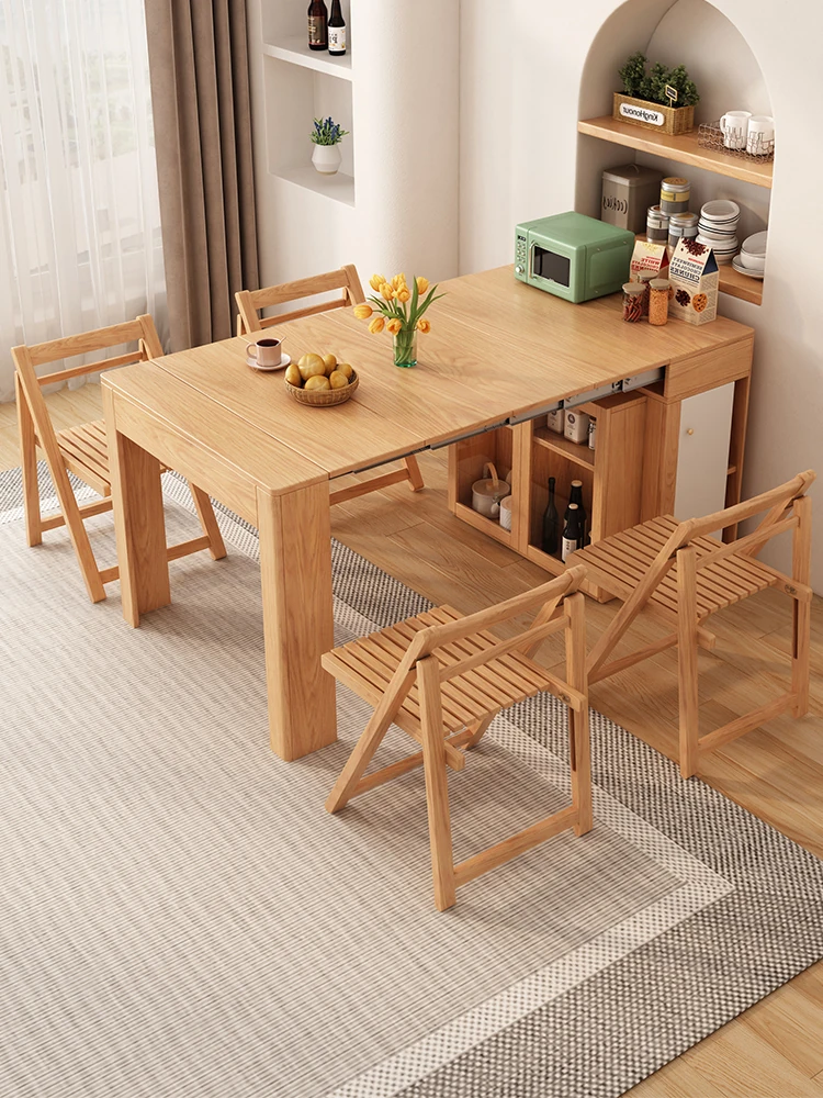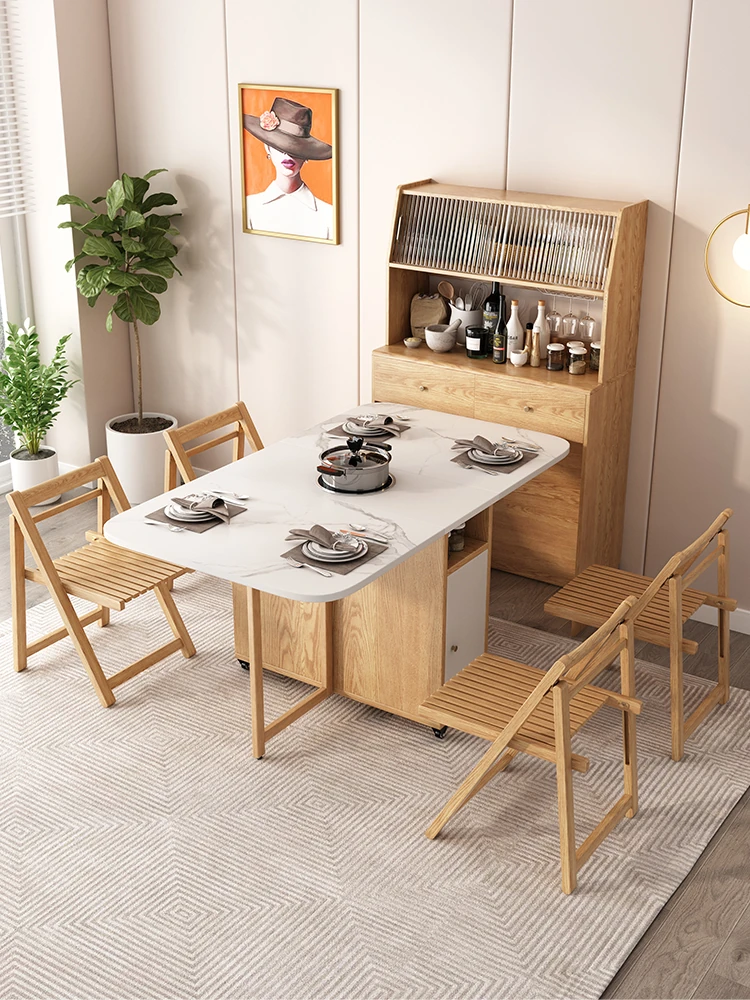 北欧スタイルの折りたたみダイニングテーブル&サイドボード一体型:多機能で実用的な無垢材を使用し、省スペースの小型住宅にぴったりの伸縮式収納式。