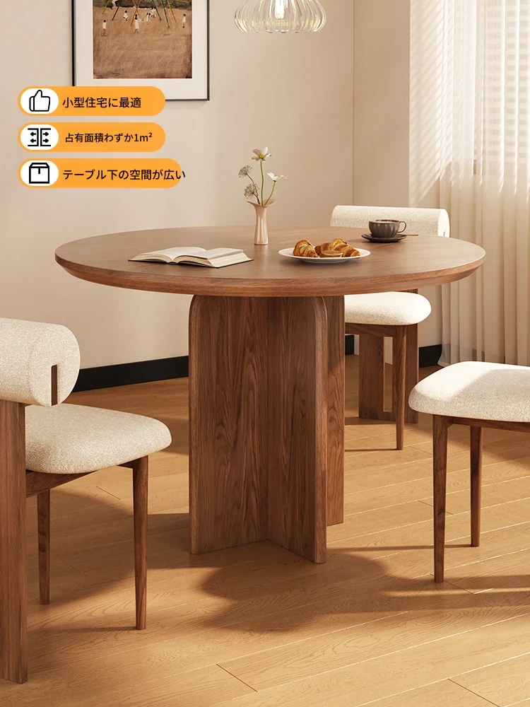 クリームスタイルのクリエイティブなデザイン!天然木材を使用したラウンドダイニングテーブル
