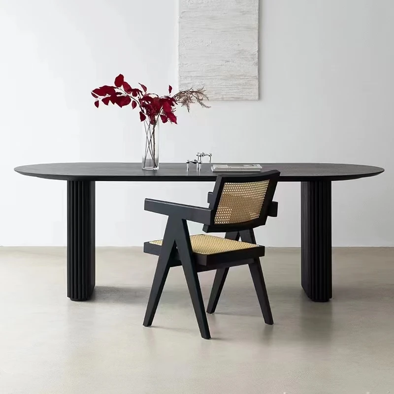 【フレンチスタイル】魅力いっぱいの黒い無垢材製ダイニングテーブル - モダンな楕円形カフェテーブル。家庭用ダイニングルームに最適な長テーブルで、トレンドの侘寂風デザインを取り入れたインスタ映え間違いなし!