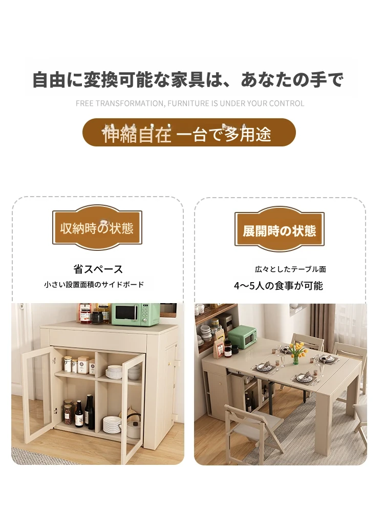 天然木目調デザインの伸縮ダイニングテーブルとキャビネット一体型、省スペースで使える多機能家具。小さなお部屋にもぴったり!折りたたみ可能で、収納力抜群、自由自在に変形して快適な生活空間を演出します。