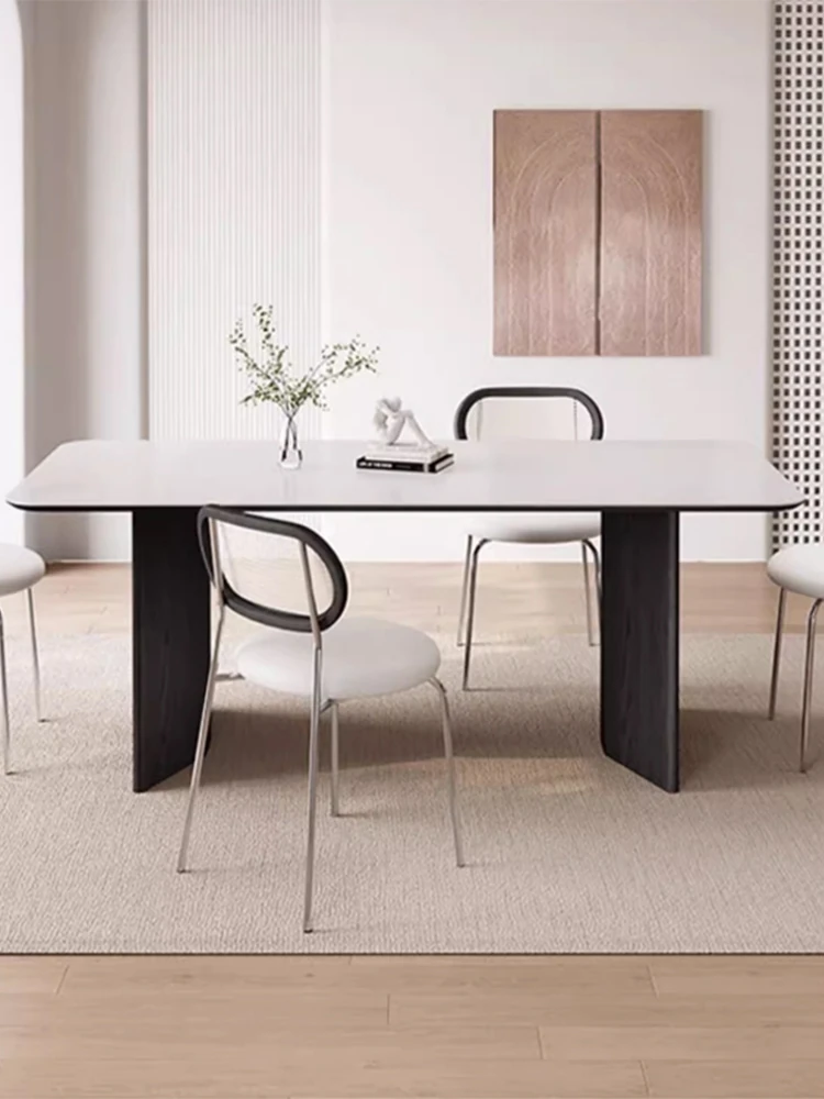 ヴィンテージ風クリーム色無垢材ダイニングテーブル&チェアセット 家庭用フレンチレトロ 12mm岩板 極簡ミニマリスト食卓セット - おしゃれで魅力的な侘び寂びスタイルを楽しむ