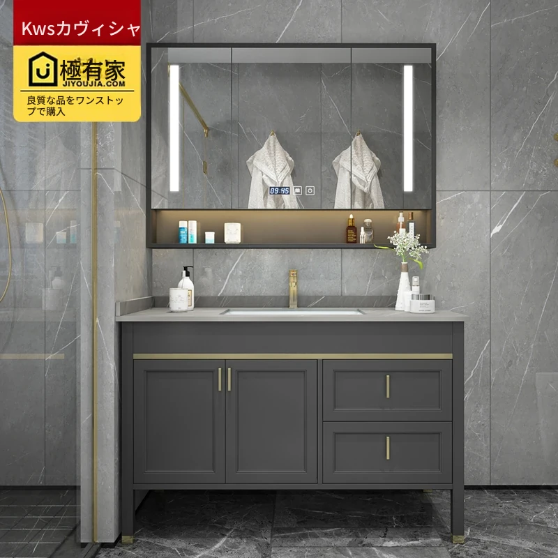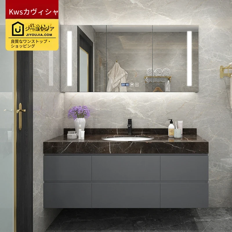 モダンでエレガントなインテリアに最適:高級感あふれる岩盤バスルームキャビネットセット-洗面台&スマートバスルームミラー付き洗面化粧台。