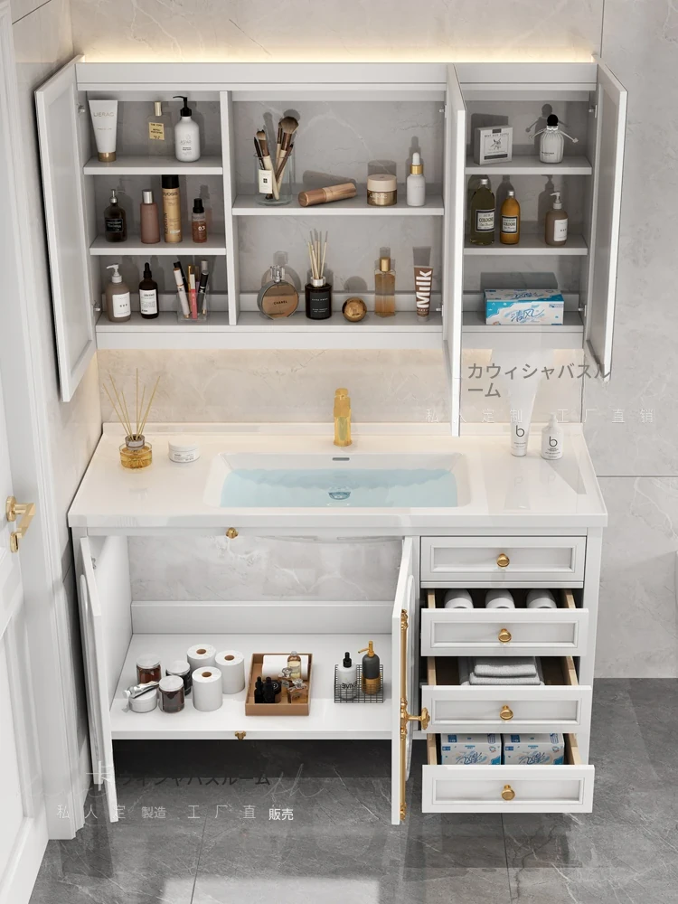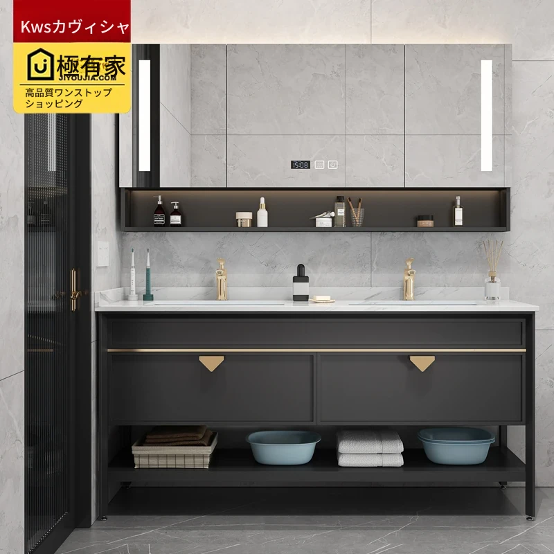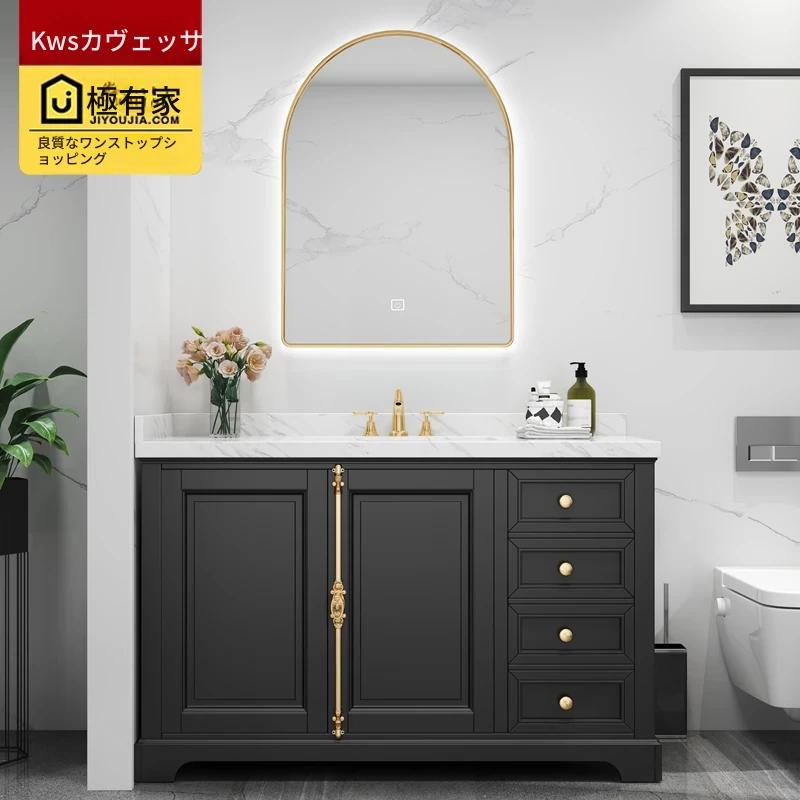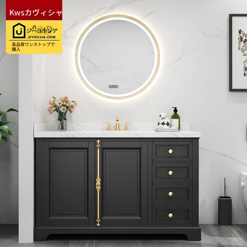 アメリカンスタイルの軽量ラグジュアリーバスルームキャビネットセット:実木洗面台、床置き岩板、スマートバスルーム収納で、洗練された空間を演出。