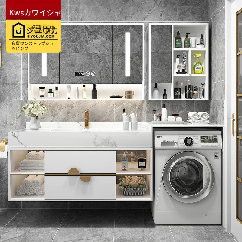 【魅力の空間】バルコニー洗濯機キャビネットセット - 岩ボード一体型洗面台、天然木製バスルームキャビネット、軽ラグジュアリーデザインの洗面台。