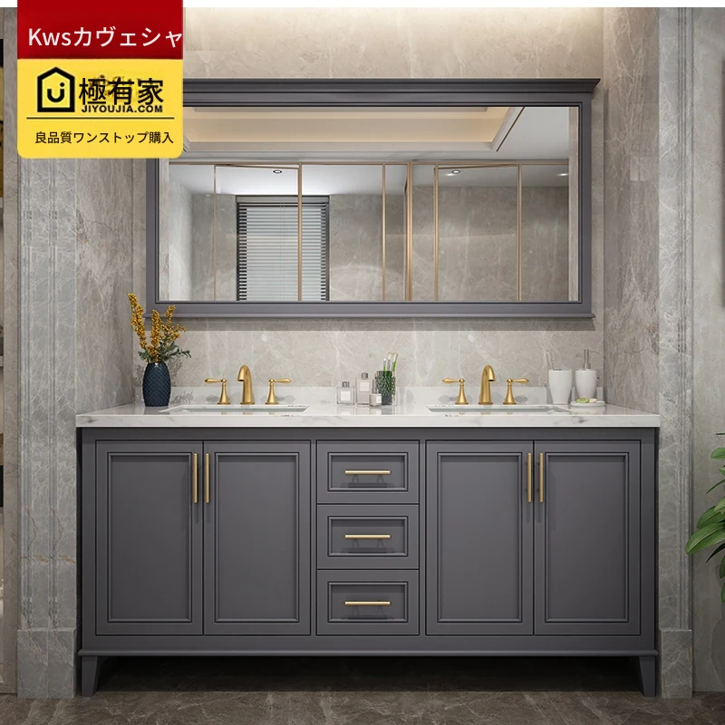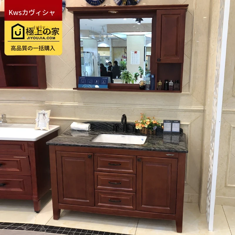 アメリカンスタイルの高級天然木製バスルームキャビネットセット―ヨーロッパ風オーク材洗面化粧台、洗面所用洗顔ボウルキャビネット。耐久性とエレガンスを兼ね備えたデザインで、あなたのバスルームをワンランクアップ!