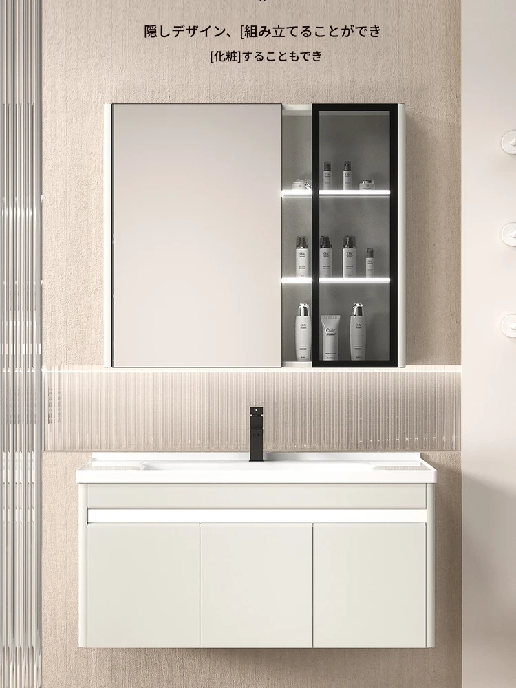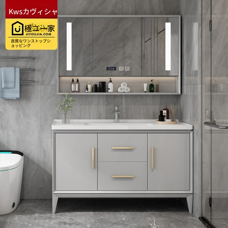 現代シンプルデザイン!ステンレス製バスルームキャビネット&セラミック一体型洗面台セット - スマートミラーキャビネット付き