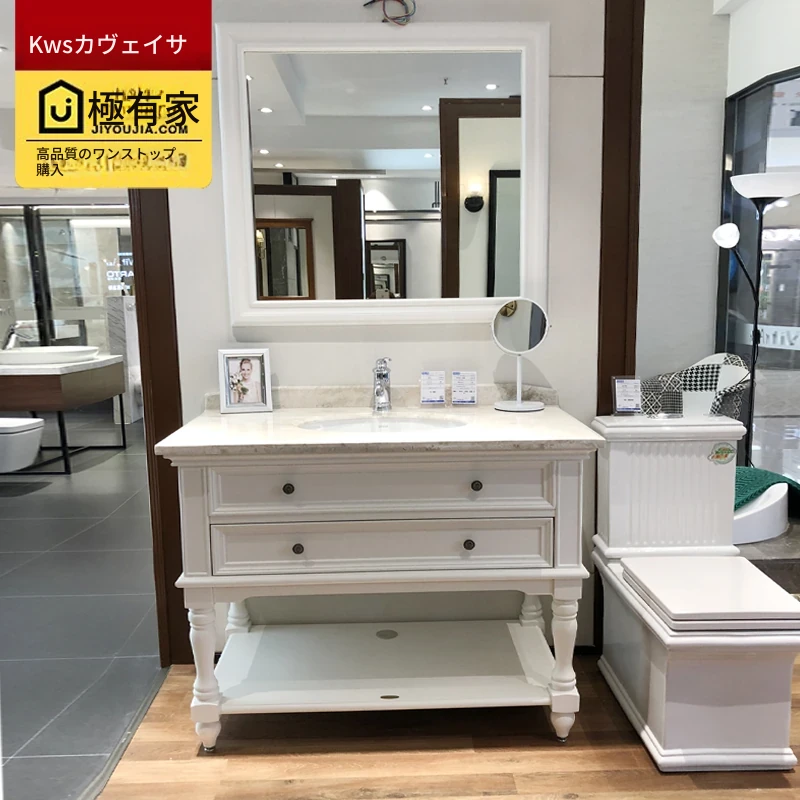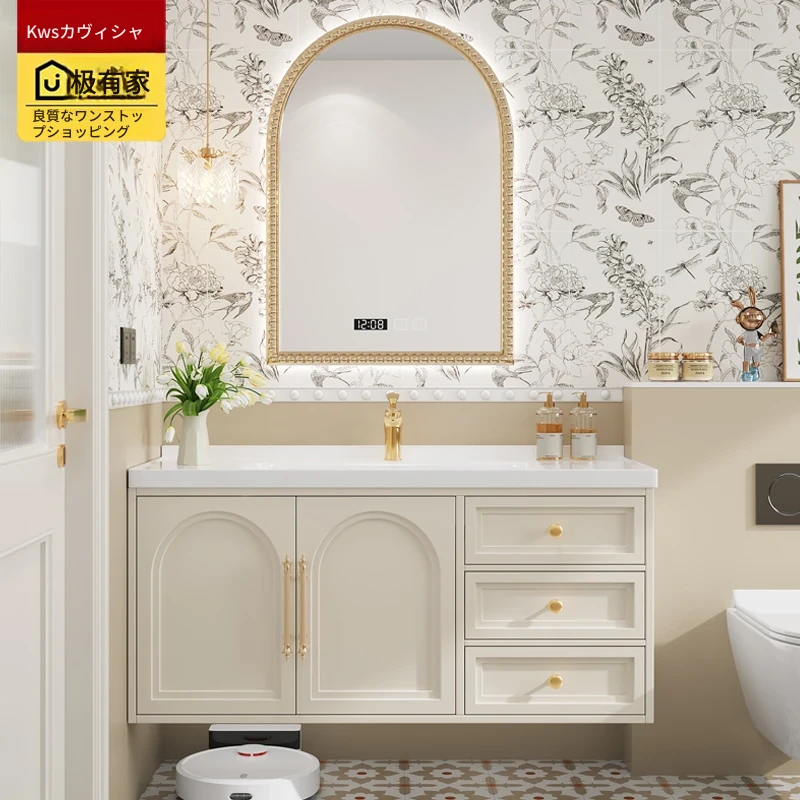 【新登場】エレガントなフレンチスタイル!高級陶器一体型バニティセット - 木製スマートバスルームキャビネットで洗練されたバス空間へ。