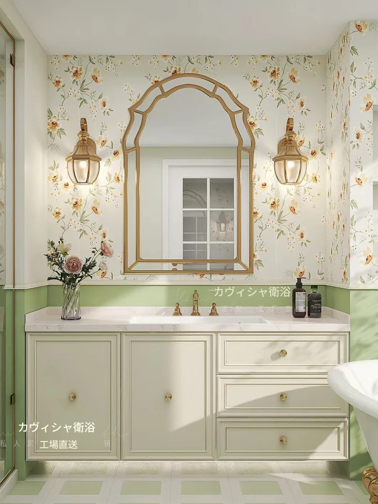 フレンチヴィンテージアボカドグリーンバスルームキャビネットセット - 陶器製の一体型洗面ボウルとオーク無垢材の洗面化粧台で、洗顔や手洗いをスタイリッシュに!おしゃれで機能的なバスルームを演出します。