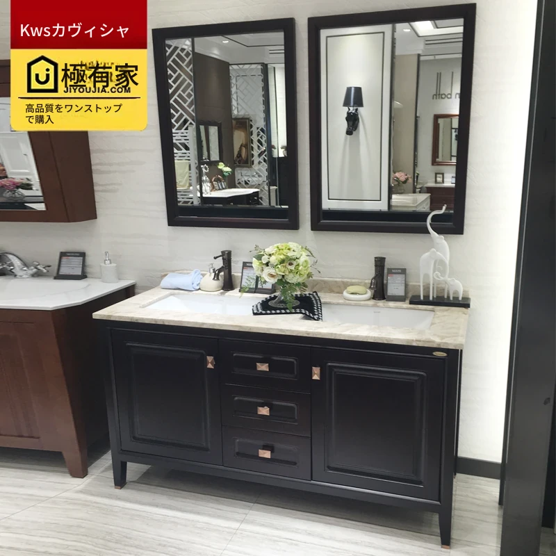 シンプルでスタイリッシュなアメリカンオーク材バスルームキャビネットセット:ブラックの床置き洗面化粧台。耐久性抜群の天然木で、洗練されたバスルーム空間を演出。