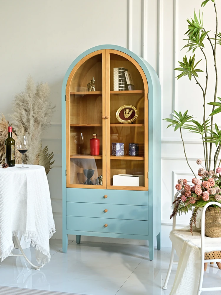 北欧スタイルの無垢材ダイニングサイドキャビネット|モダンでシンプルなデザイン|ガラス収納付きで、リビングにぴったり|アーチ型の美しい形状が魅力!|ホームバーとしてもおすすめの展示酒柜!