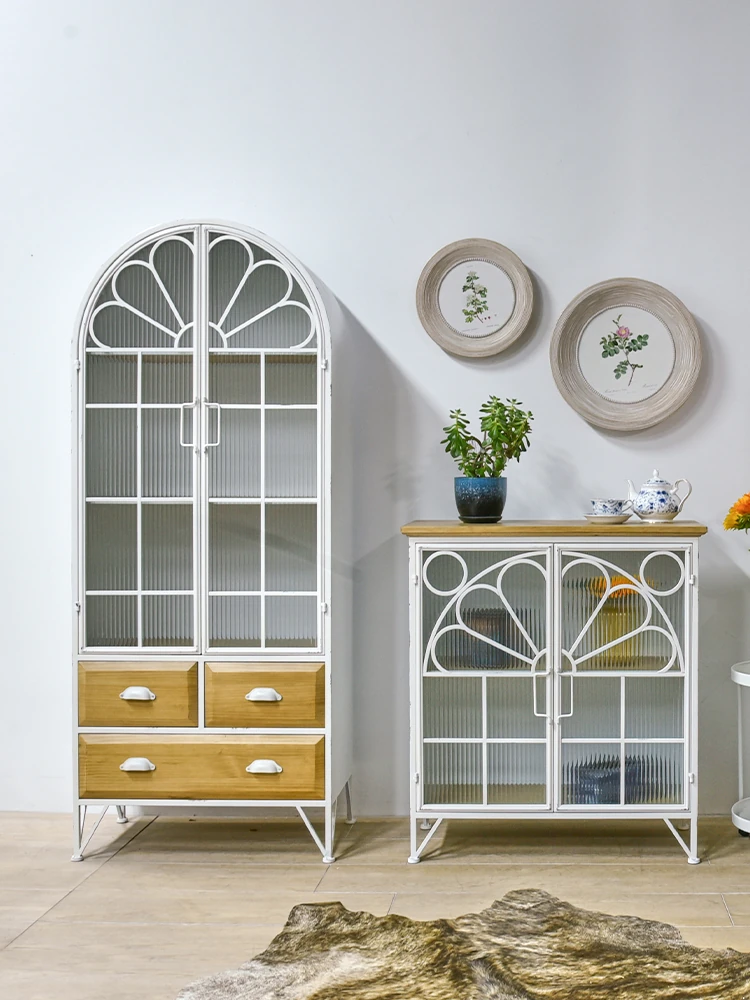 アメリカンヴィンテージ風アイアンアートの両開きガラス扉付き楕円形ブックケース - アーチ型でおしゃれな床置き収納・コレクションキャビネット、多層ディスプレイが可能!