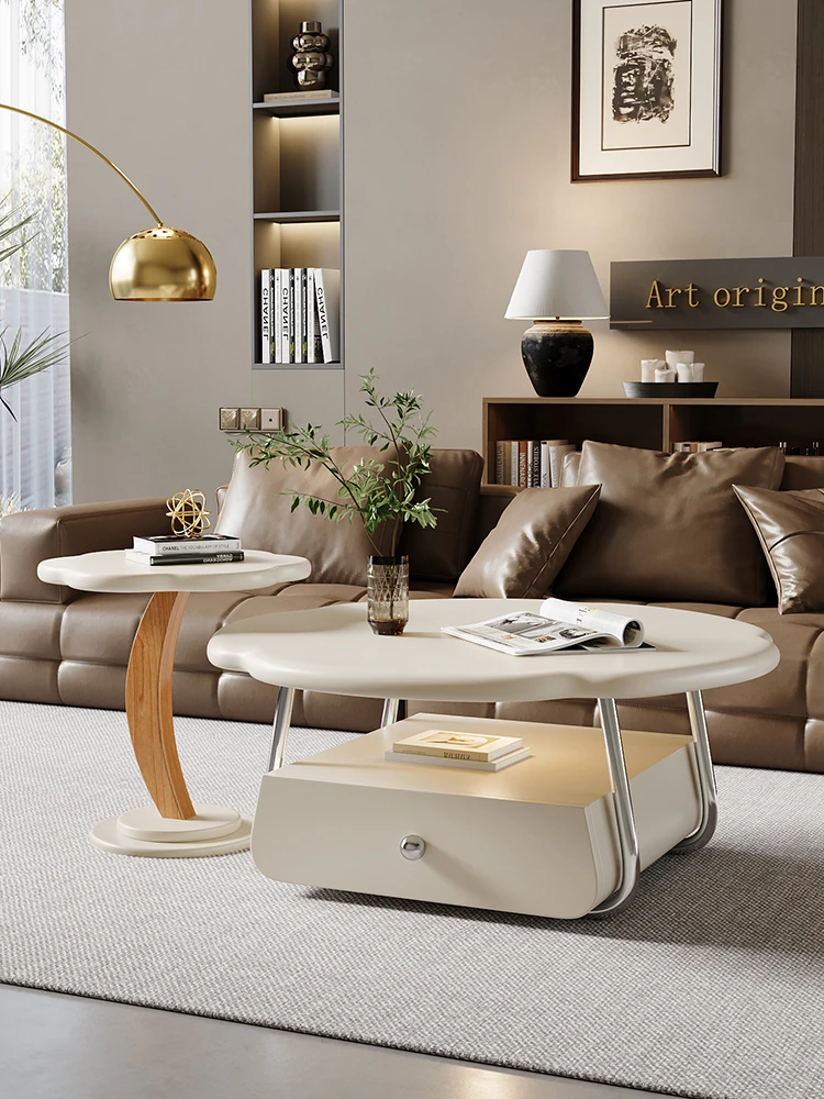 クリームテイストのおしゃれなラウンドリビングテーブル - 小スペースにもぴったりな中古風シンプル収納、現代的で高級感あふれるデザイン!