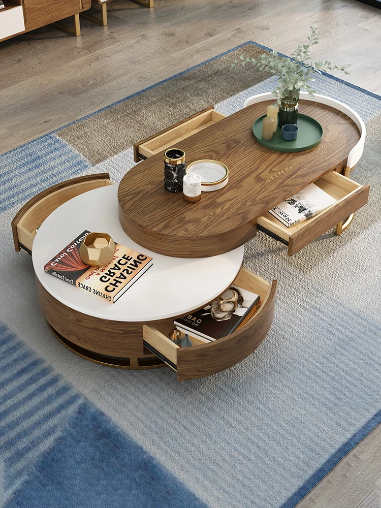 北欧スタイルのラウンド昇降式リビングテーブルセット-小型高級空間にぴったり、多機能な収納付き!