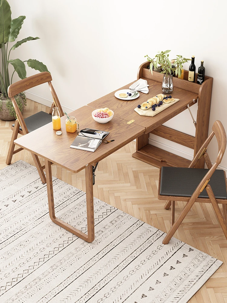 Nordic Multi-Functional Foldable Dining Table Set - Solid Wood Space-Saving Design for Small Homes, Wall-Mounted Convertible & Extendable Table with Chairs