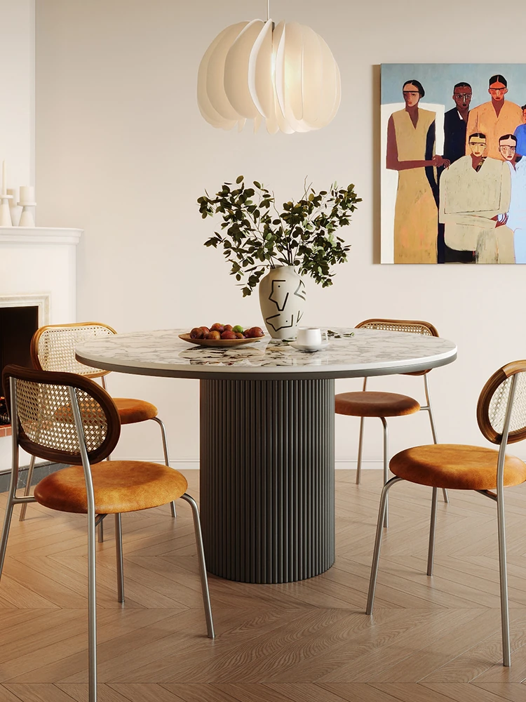 Vintage-Style Round Dining Table - French Retro Design with Solid Wood and Stone Veneer, Perfect for Chic Home Conversations
