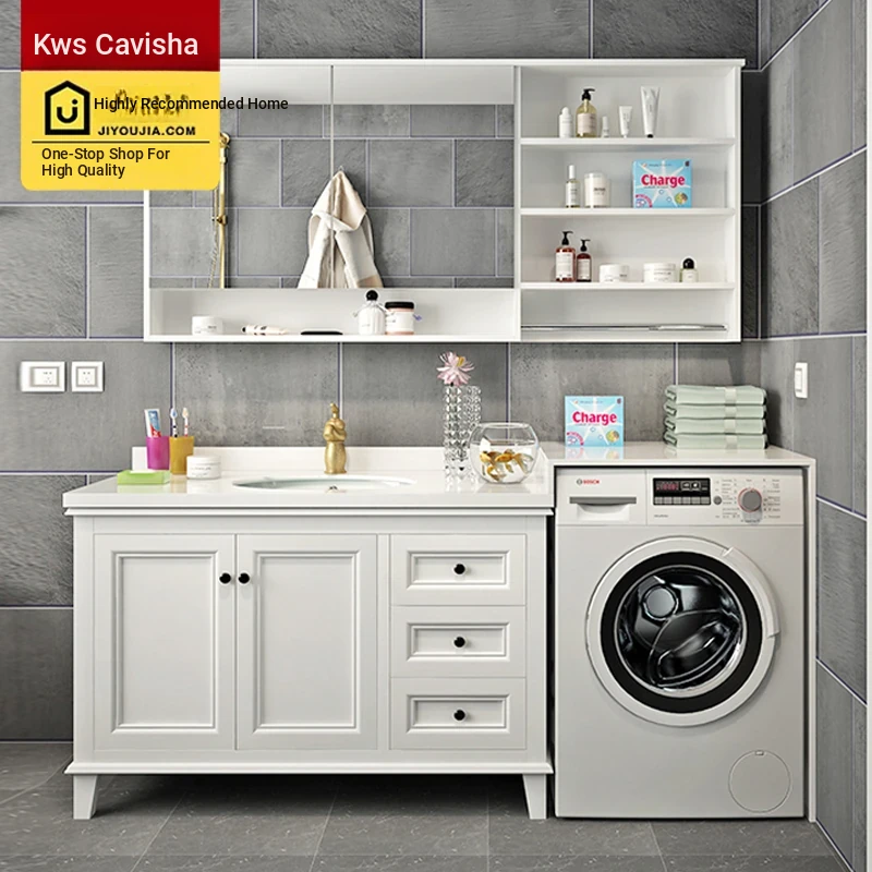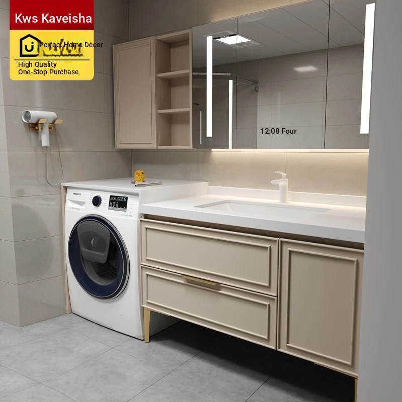 Title: Stylish All-in-One Laundry Cabinet with Seamless Ceramic Basin and Rock Board Design for Modern Balconies - Perfect Creamy Bathroom Vanity Combo