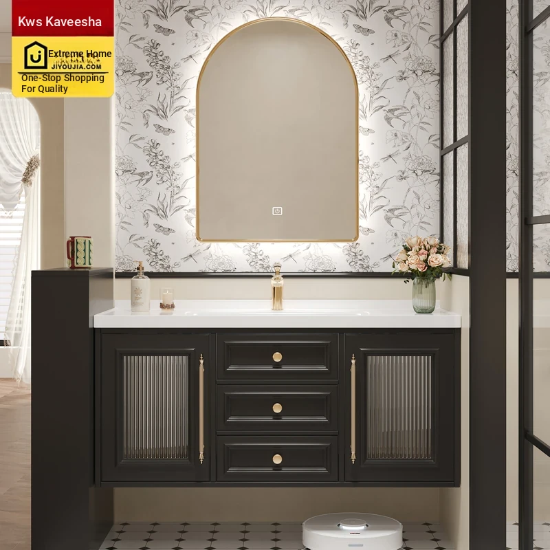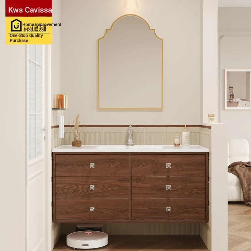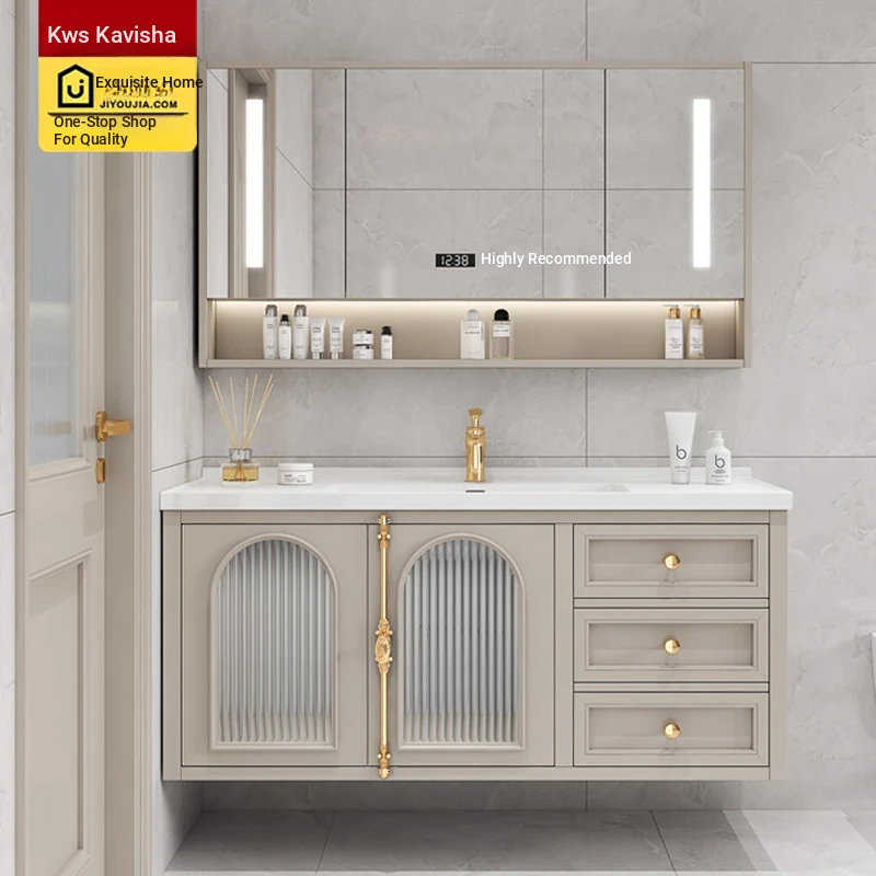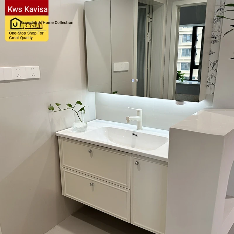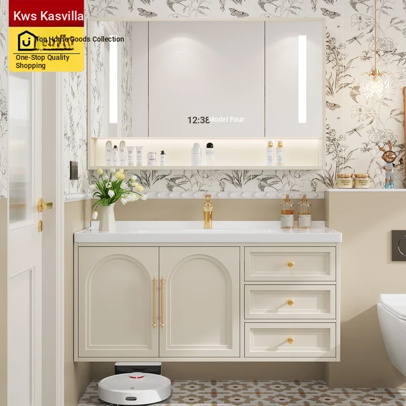 French Cream-Style Bathroom Vanity Set: Smart Solid Wood Mirror Cabinet with Ceramic Integrated Sink for a Luxurious Experience