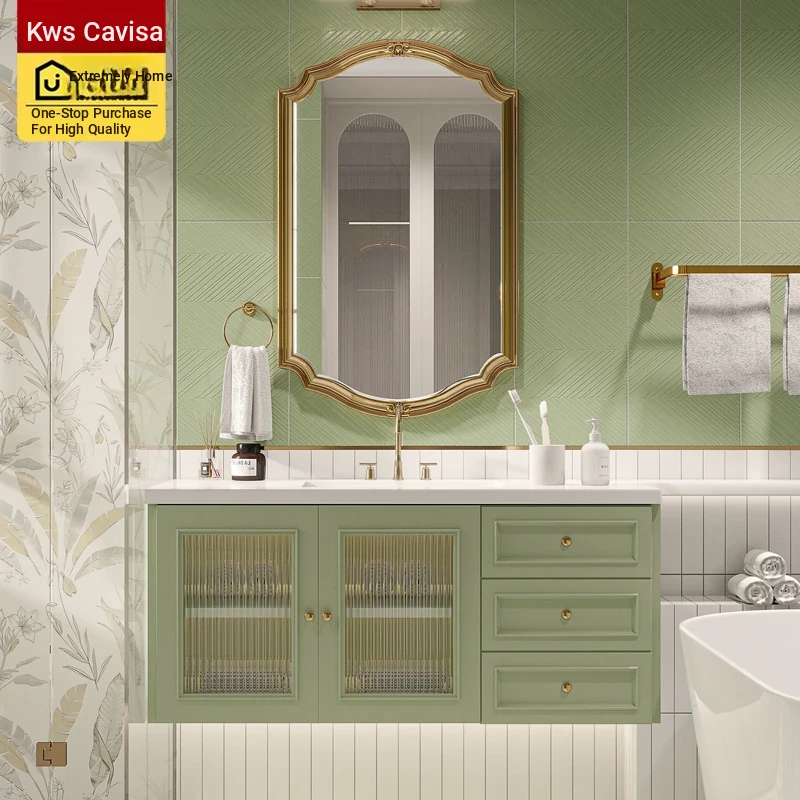 French-Style Luxury Bathroom Vanity Set with Integrated Ceramic Sink - Elegant Green Bathroom Cabinet for Washing and Grooming