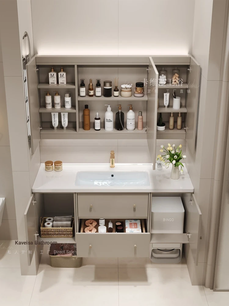 Creamy 304 Stainless Steel Bathroom Vanity Set: Integrated Ceramic Sink Wash Basin with Smart Mirror Cabinet - Modern Elegance for Your Home