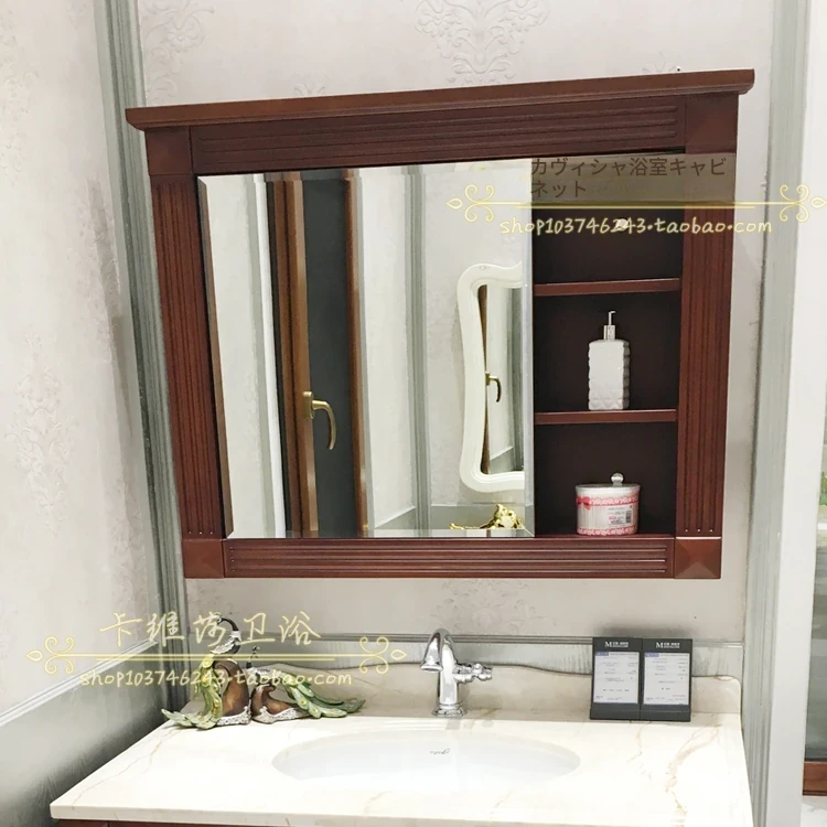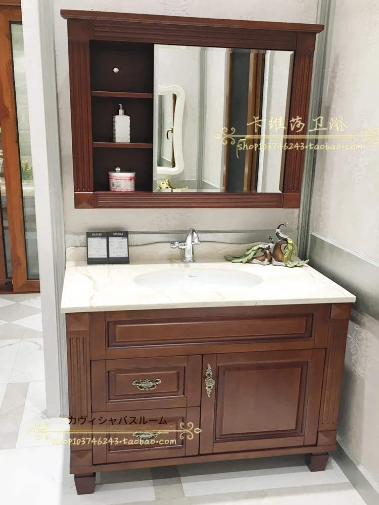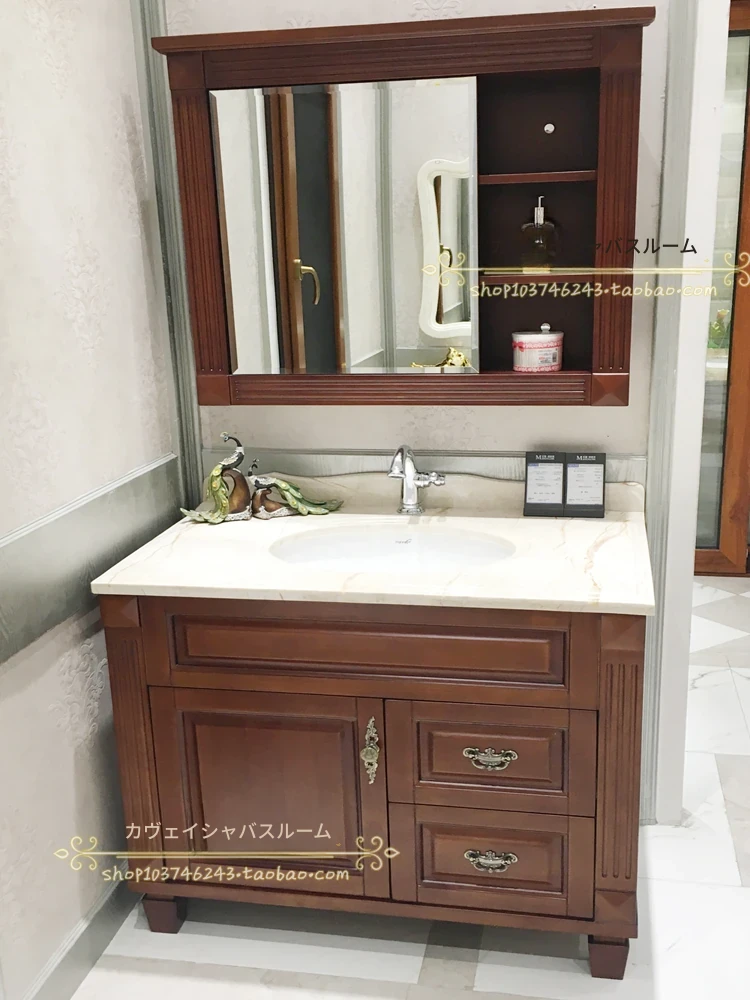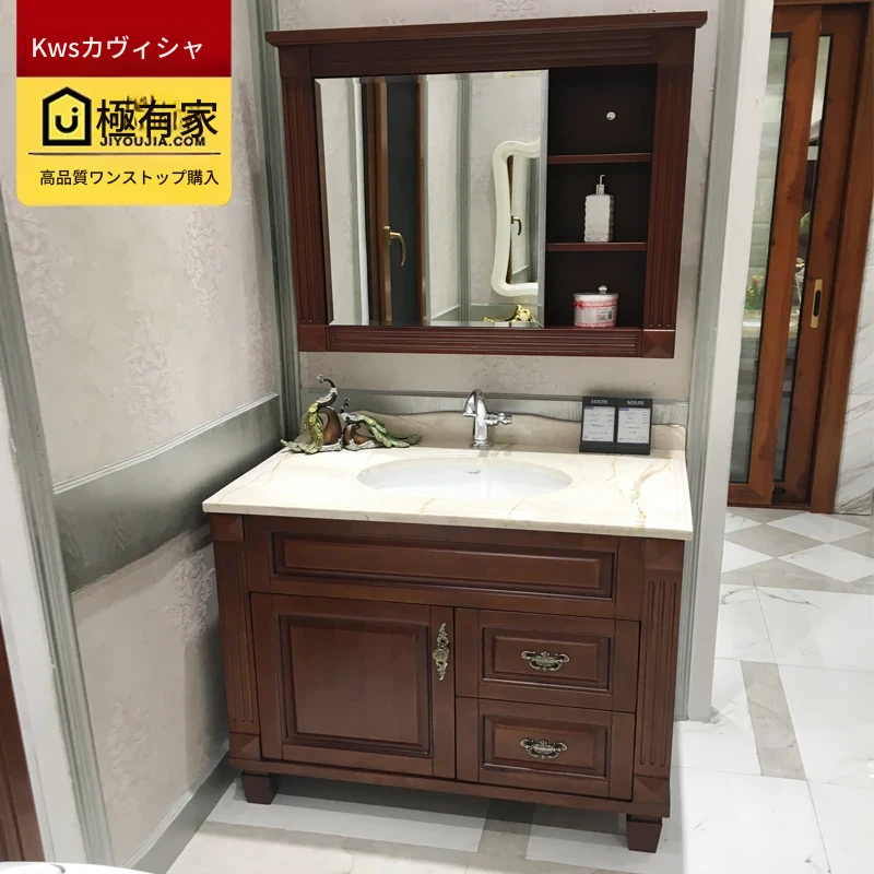 アメリカンスタイルのオーク無垢材バスルームキャビネットセット - 高級感あふれる洗面化粧台、床置きタイプ洗面シンクでおしゃれなバスルームを演出