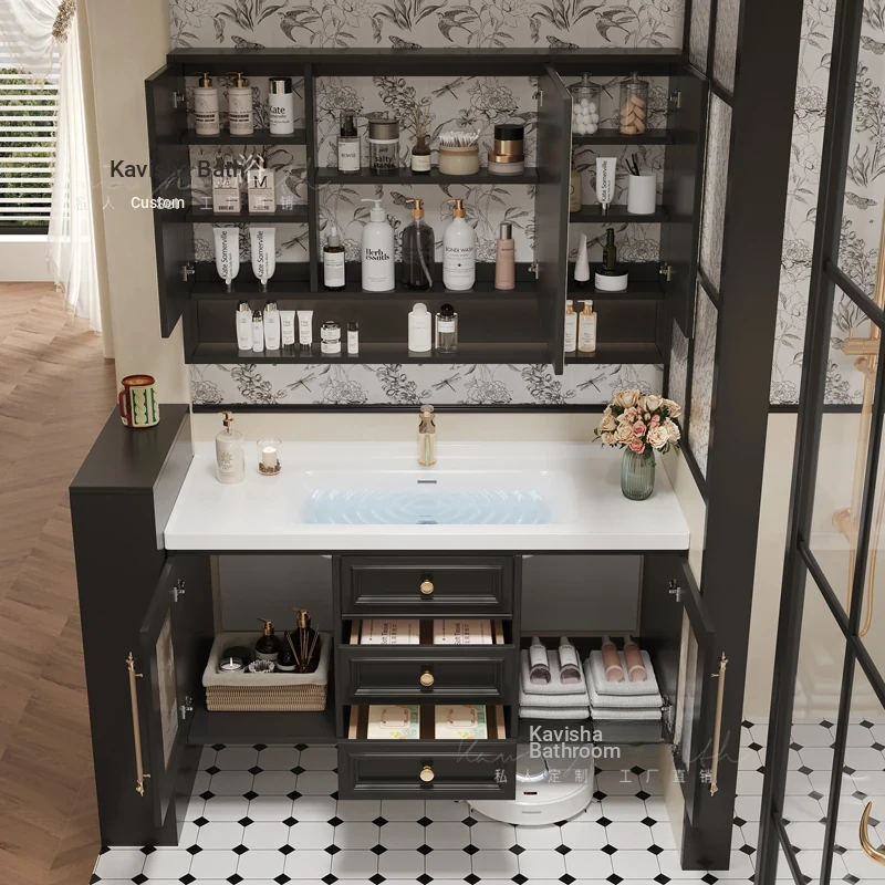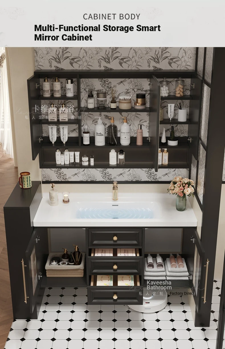 French Vintage Bathroom Vanity with Mirror Cabinet - Elegant Black Solid Wood Design, Integrated Ceramic Sink - Perfect for a Classic Touch in Your Washroom