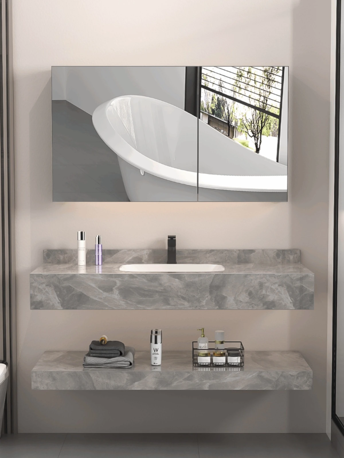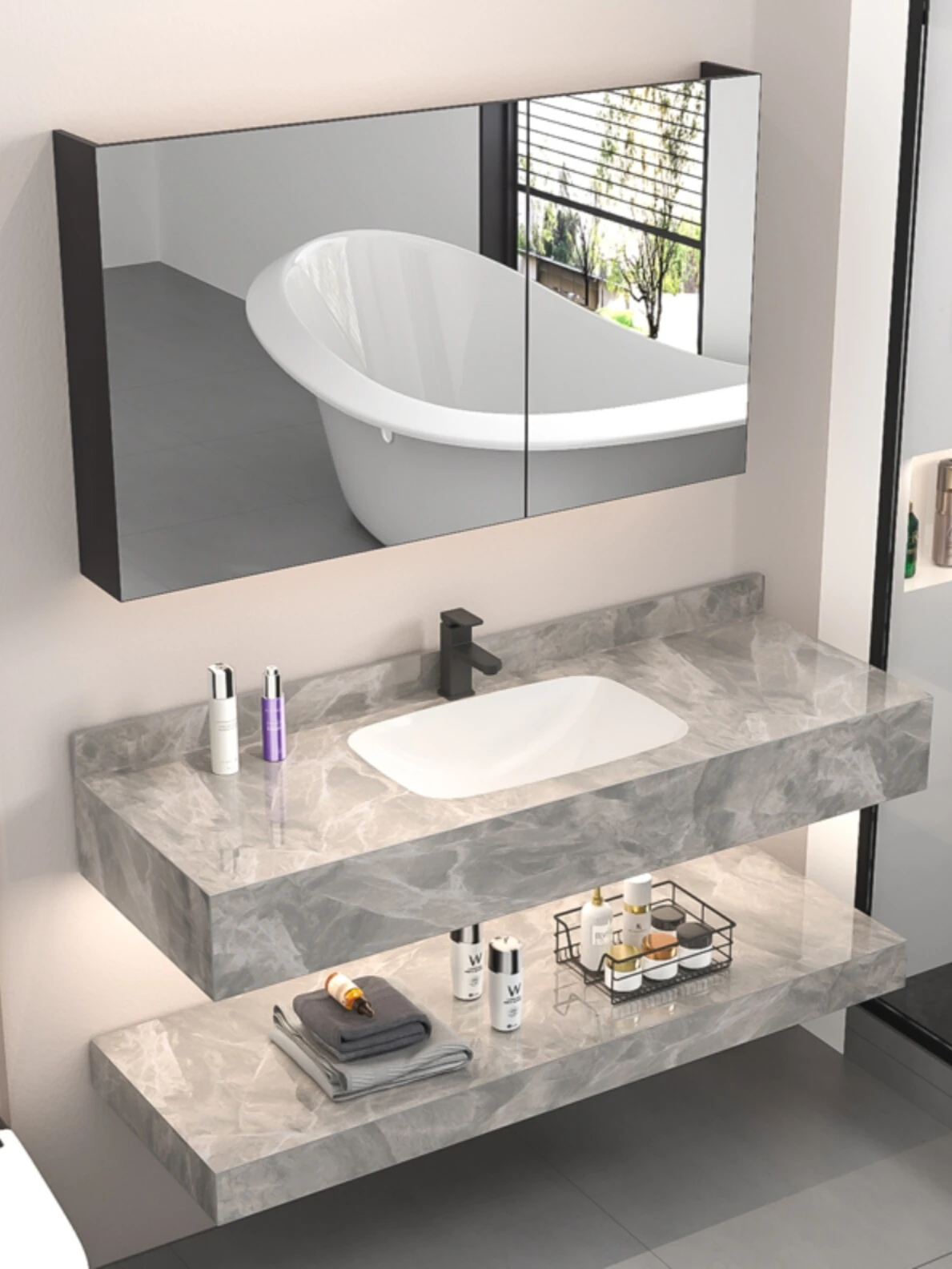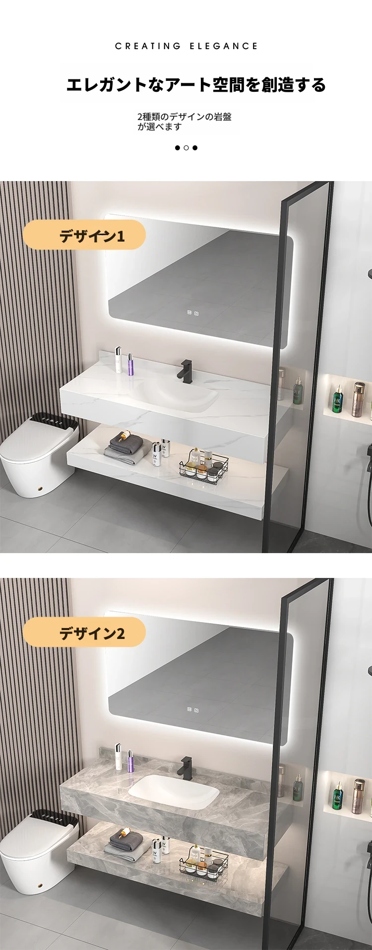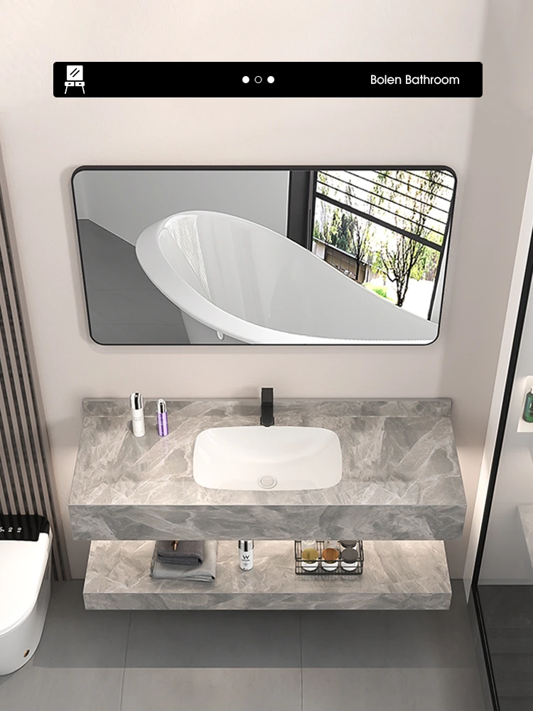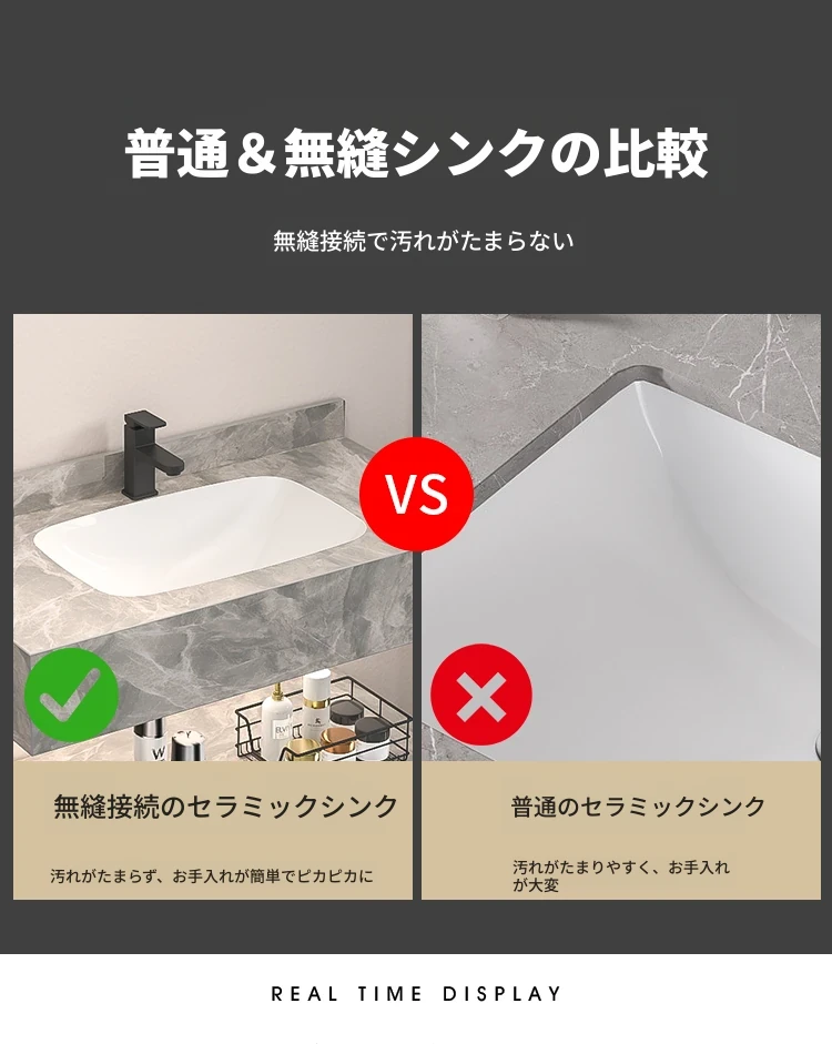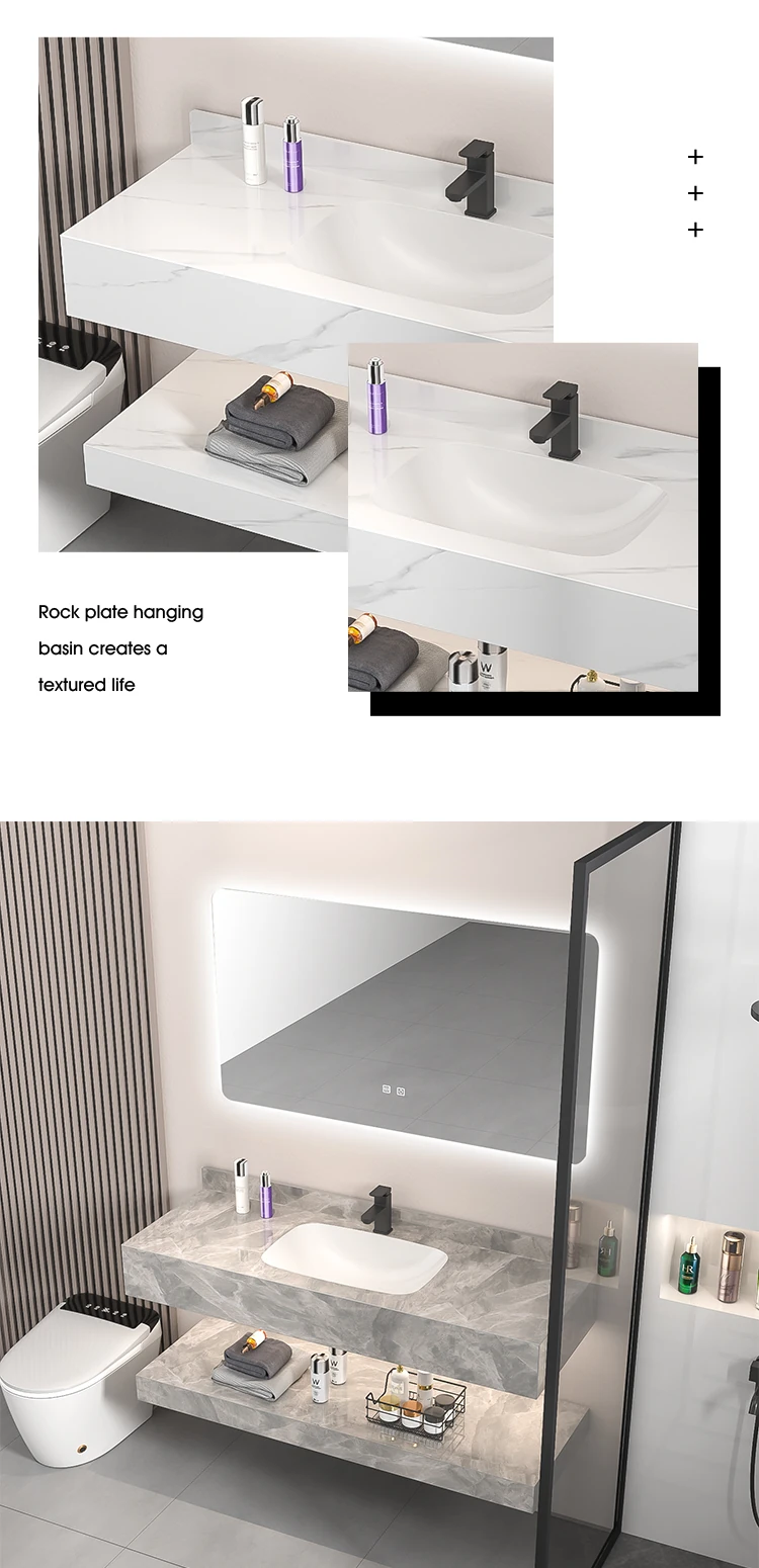 【魅力浴室】贅沢なダブルレイヤー!シームレスな洗面ボウル付き岩板バスキャビネット&高級陶器ミラーバスルームセットで至福のひとときをお届け