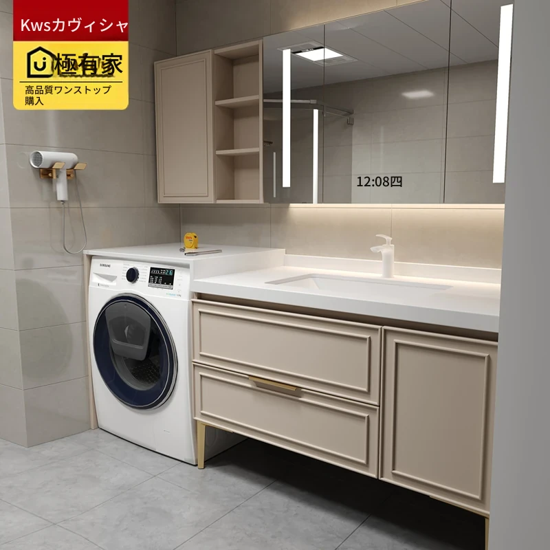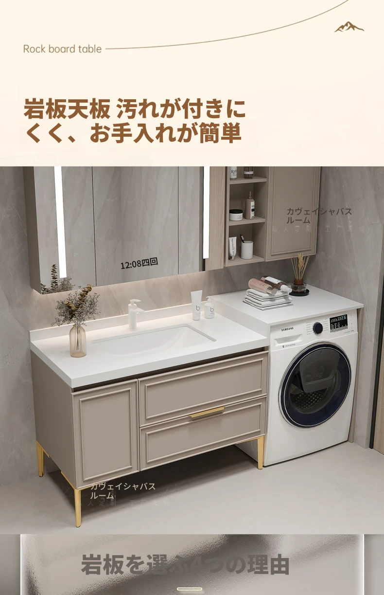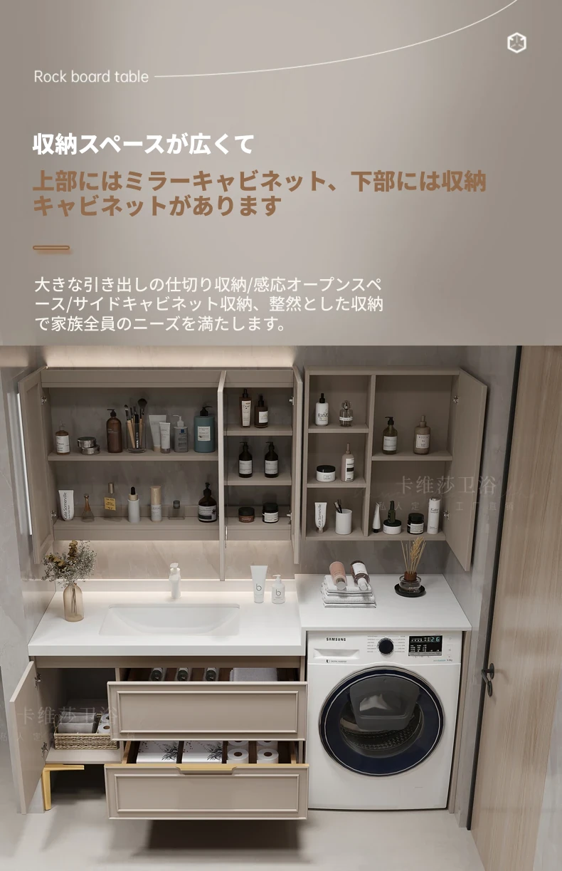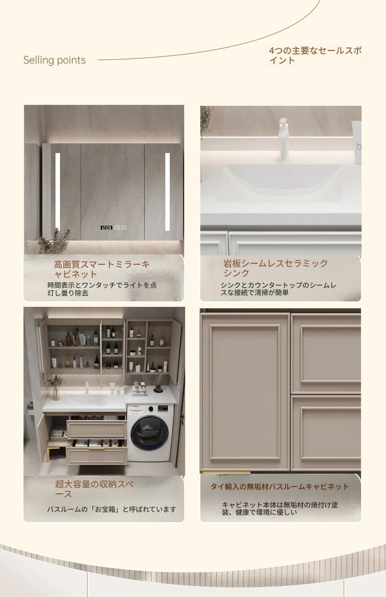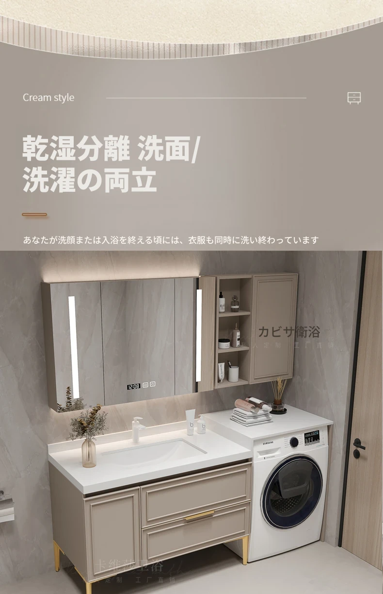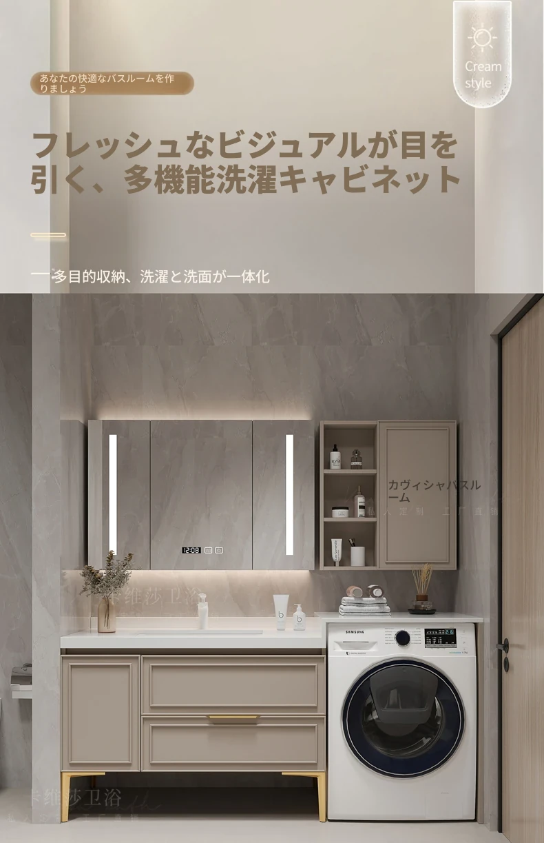 クリーム風オールインワン洗面台キャビネットセット - 陽台用オシャレな洗面所収納!縫い目のない岩板素材と陶器一体型で、洗濯機収納も可能な便利なデザイン!