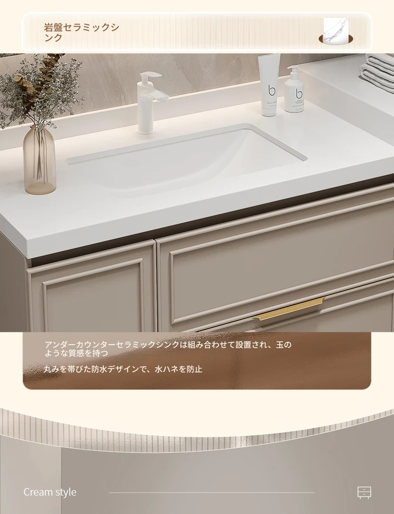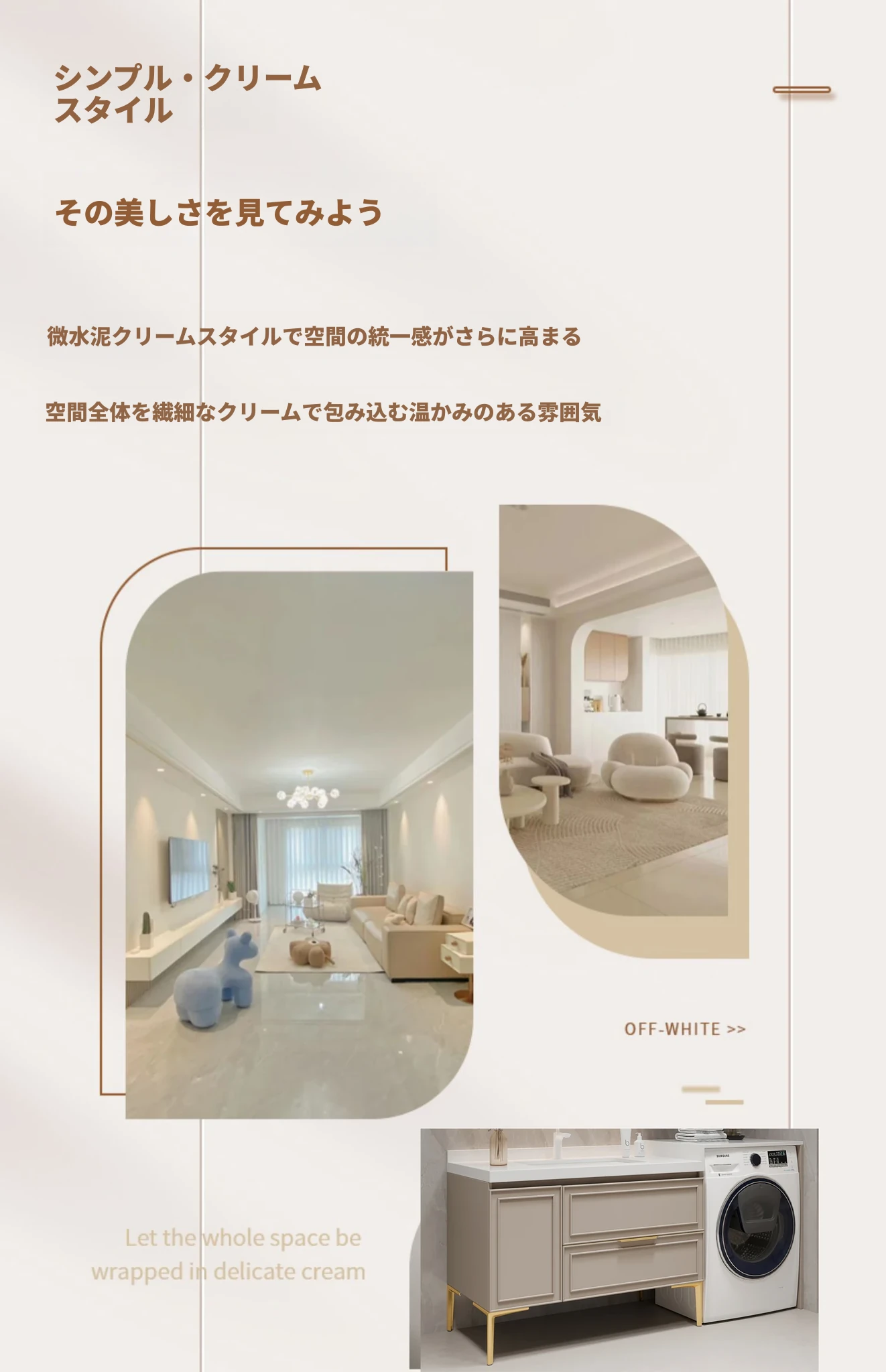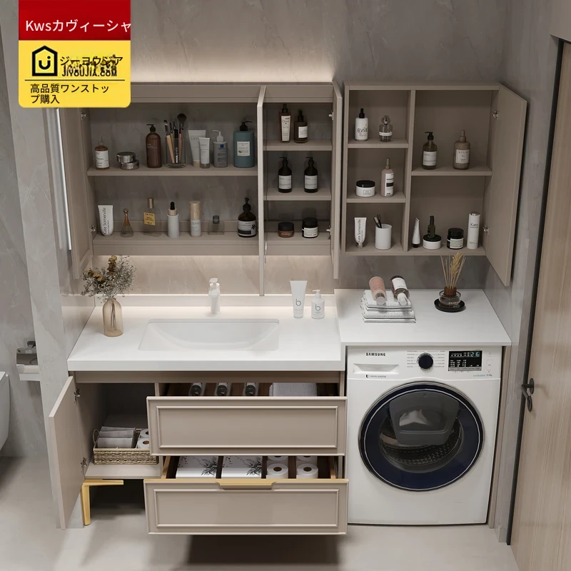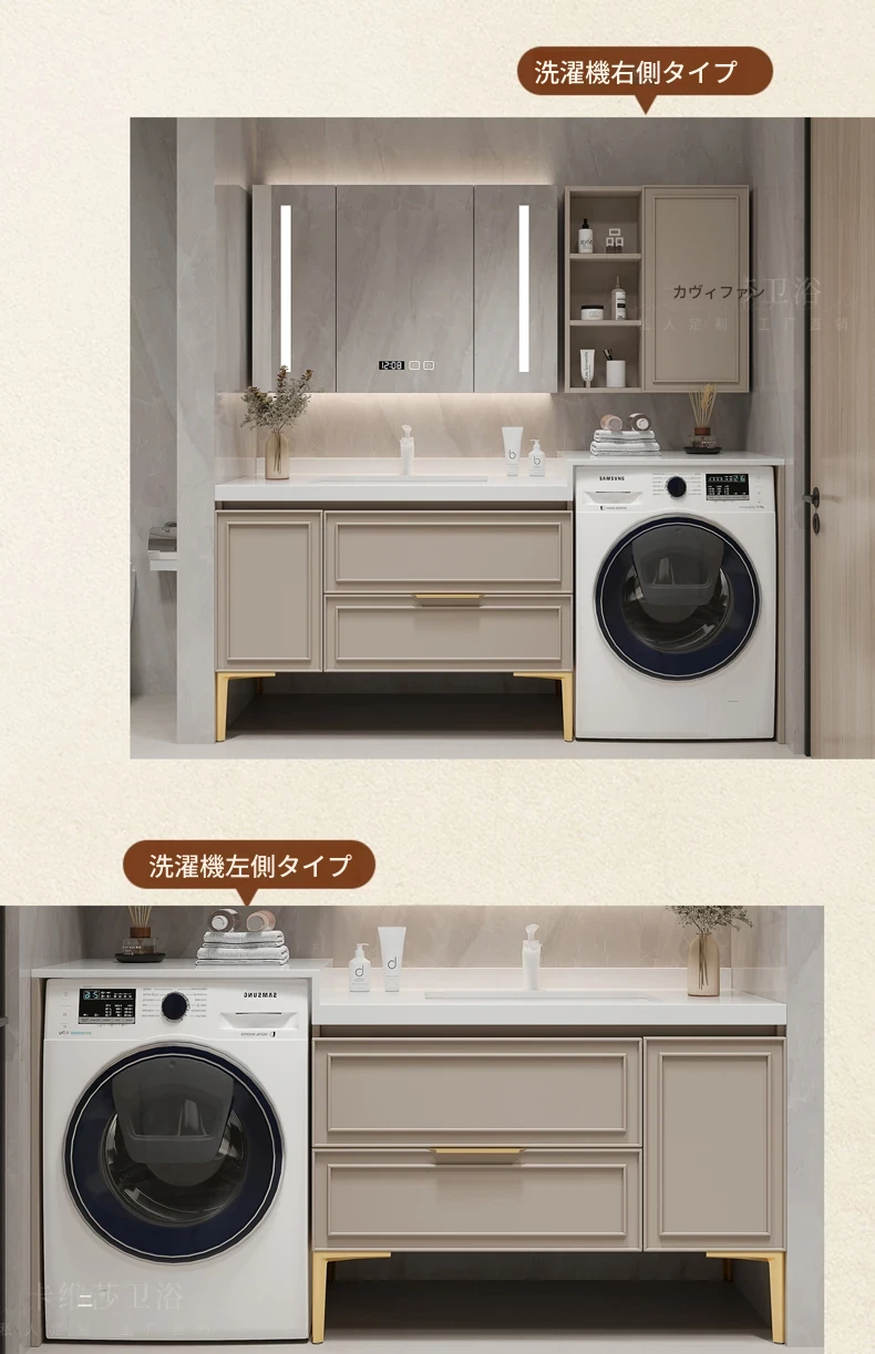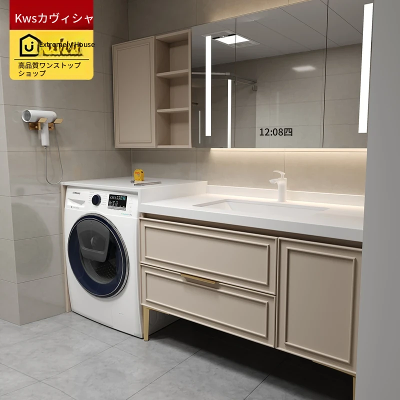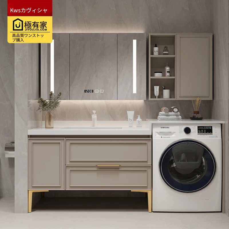 クリーム風オールインワン洗面台キャビネットセット - 陽台用オシャレな洗面所収納!縫い目のない岩板素材と陶器一体型で、洗濯機収納も可能な便利なデザイン!