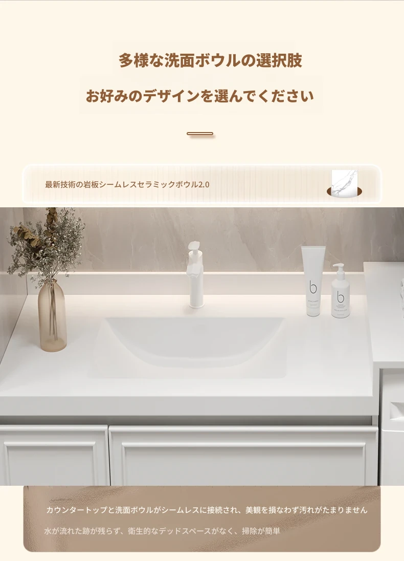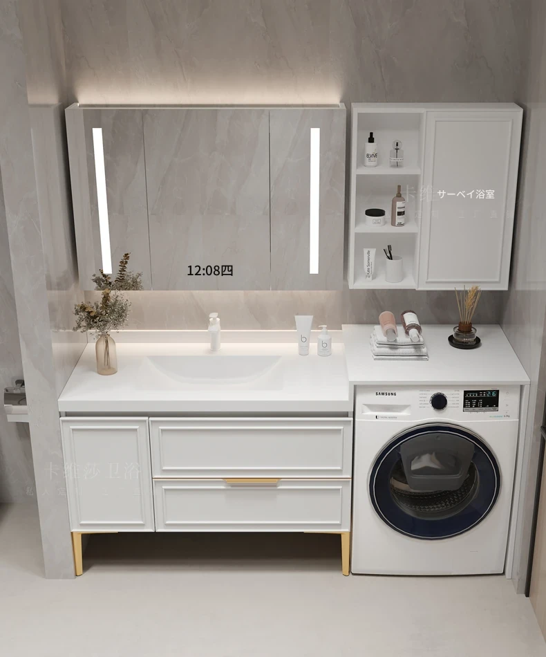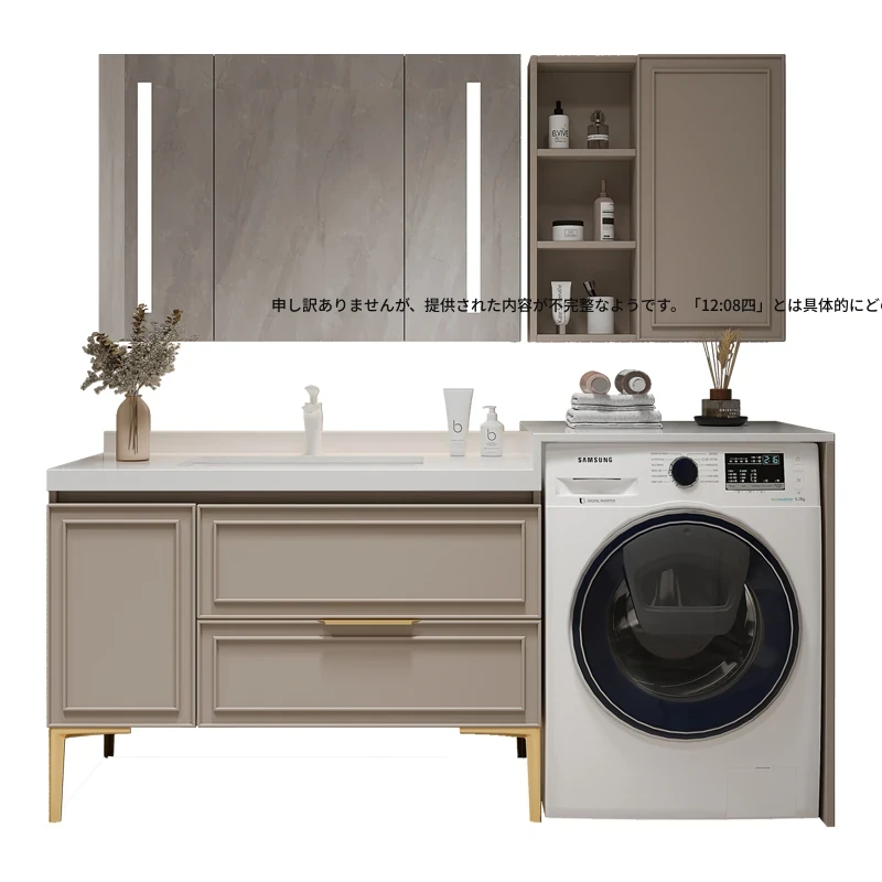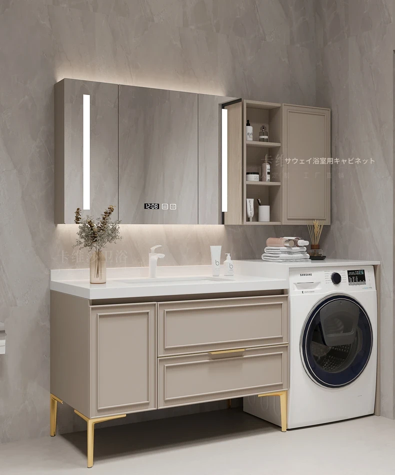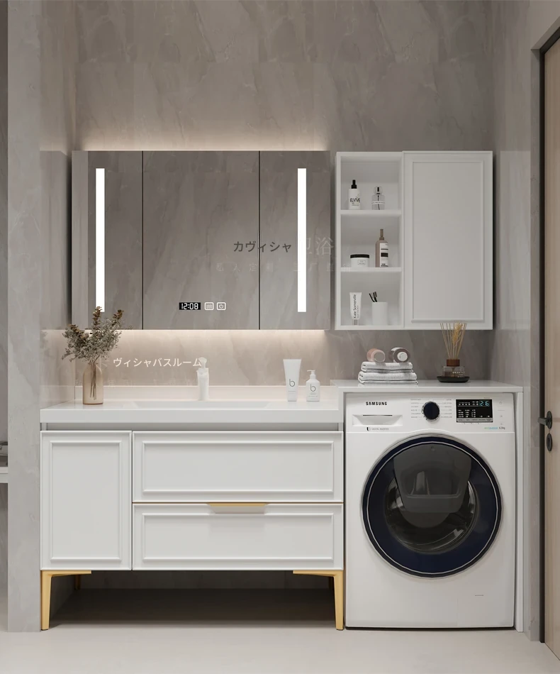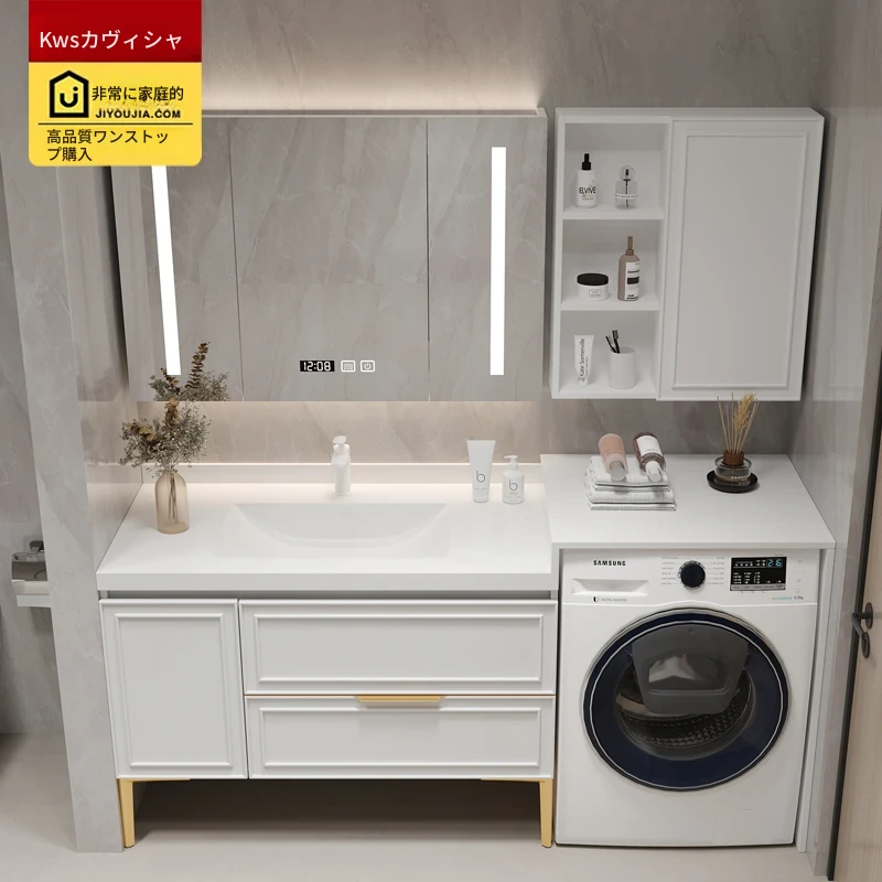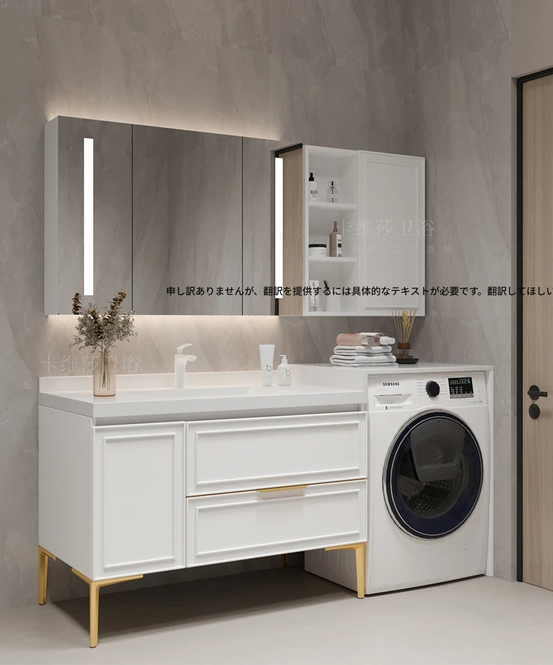 クリーム風オールインワン洗面台キャビネットセット - 陽台用オシャレな洗面所収納!縫い目のない岩板素材と陶器一体型で、洗濯機収納も可能な便利なデザイン!